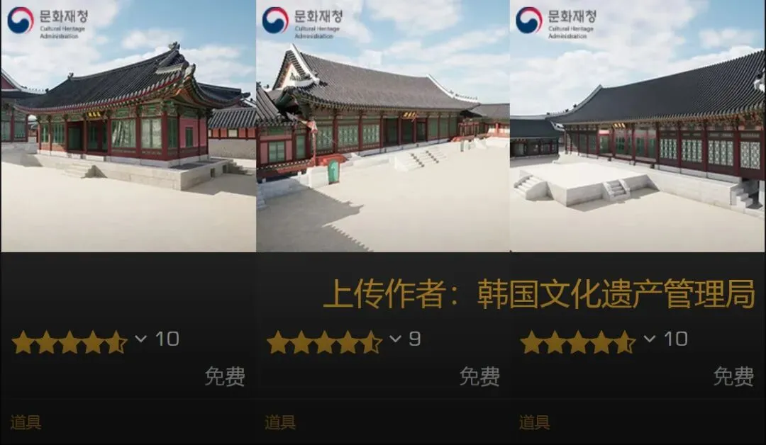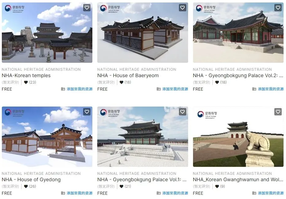 韩国虽说并没太多运用到数字资产的出圈作品,但也意识到了其中的重要性。起码在虚幻和UNITY商店这两大数字资产集散地里,就是因为NHA的官方入驻,才填补上了这方面的空白。另一个模型平台Sketchfab上,也能找到一个上传了上百件文物的“韩国国宝”系列。