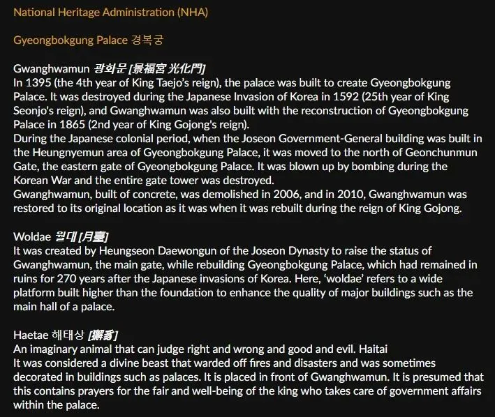 这些模型在技术细节之外,每座韩国古建筑名胜都表明了它的名字、型制和功用,具体是由谁主持营造于哪个朝代,又损毁于哪一年的哪个事件。当部分模型里出现了一些文化符号时,他们还会用英韩中三语来解释月台、獬豸这些名词。