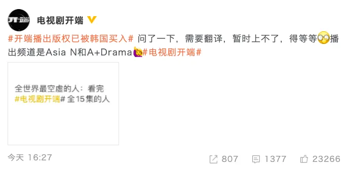 韩国确认购买时间循环短剧《开端》播出版权,将台网双播,采用原音+字幕形式,播出时间待定。随后,《开端》官博发文回应:“问了一下,需要翻译,暂时上不了,得等等。”
