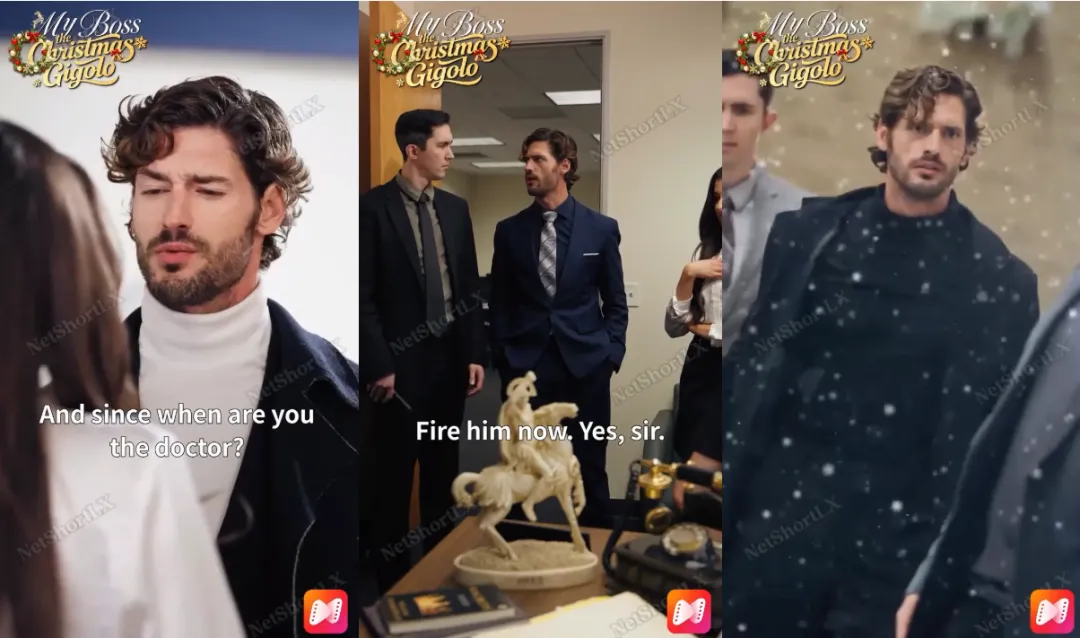 NetShort今年的圣诞主推剧便是这部《My Boss, the Christmas Gigolo》,截至发稿日前,在2025年圣诞主题短剧中投放排名最高,目前的展现估值也超过了5千万。从背景设定来看,圣诞夜、酒会、失恋,这些元素加在一起一看就知道又要有“醉后爱上你”的剧情发生了,不过这次女主是把男主直接认定为顶级牛郎,连解释都不让男主说,云雨之后甩下小费飘然离去,剧情熟悉一眼就可以看出是由国内短剧桥段改编而成。