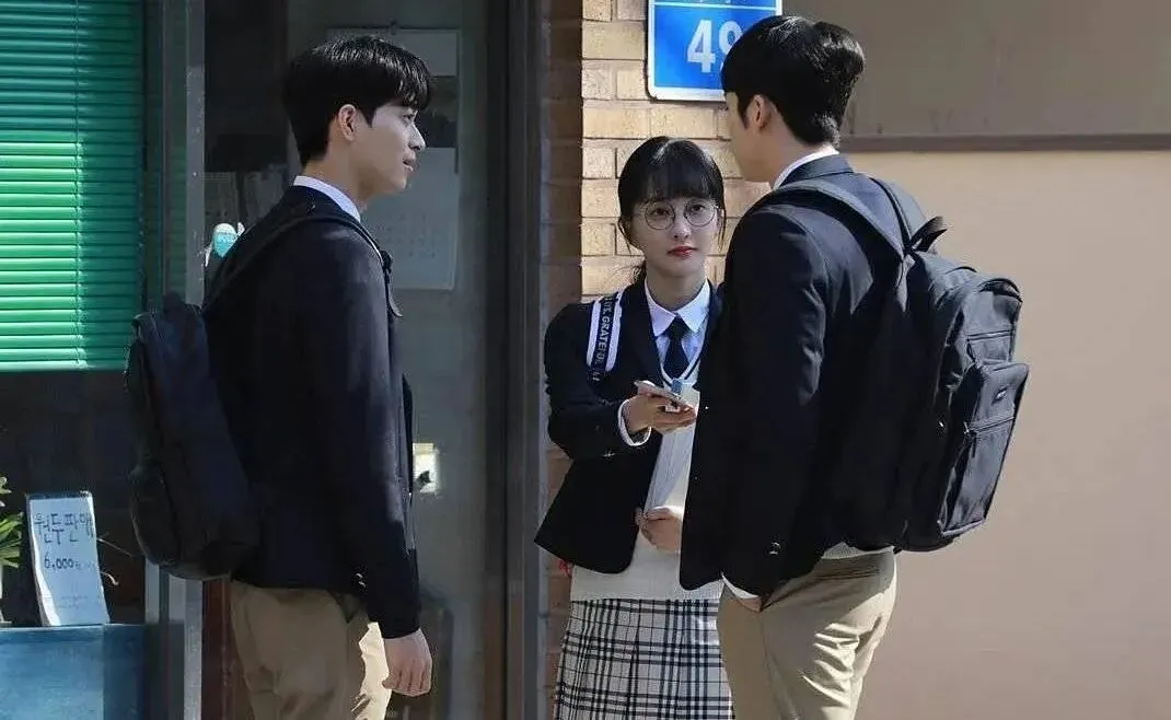 几个男生围住我们的主角韩泰柱,责问内容大概是为什么自己的女友都移情别恋到了男主身上,看脸我们就知道这还用回答吗。