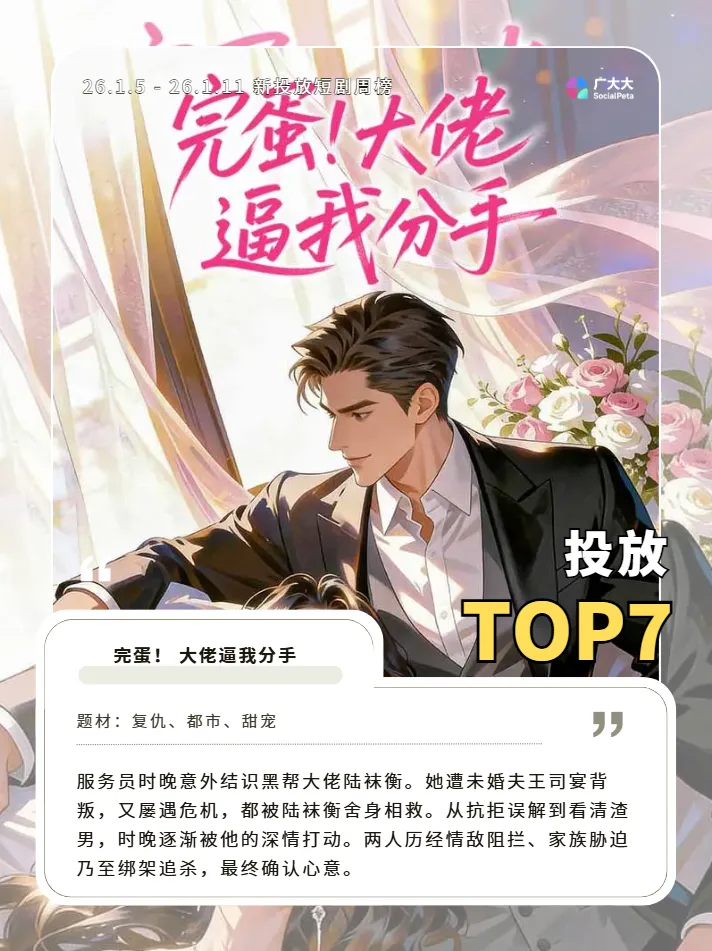 此外,该剧集在海外上线了多个版本,目前根据广大大后台数据,该剧共有6个版本在投,其中近七天内,其中主投中国港澳台的《完蛋!大佬逼我分手》和主投美国市场的《My Assertive Lover》这两部的创意数量最高,目前这两部剧素材本周内累计展现估算已经超过7000万。