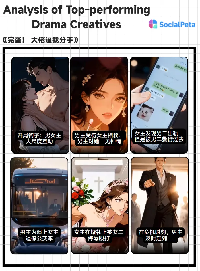 该剧素材普遍采用一种高效的叙事策略:开场常以男女主大尺度互动作为钩子迅速吸引观众,后续则通过持续叠加男女主之间充满戏剧张力的互动情节,有效维持并增强了素材的整体吸引力。