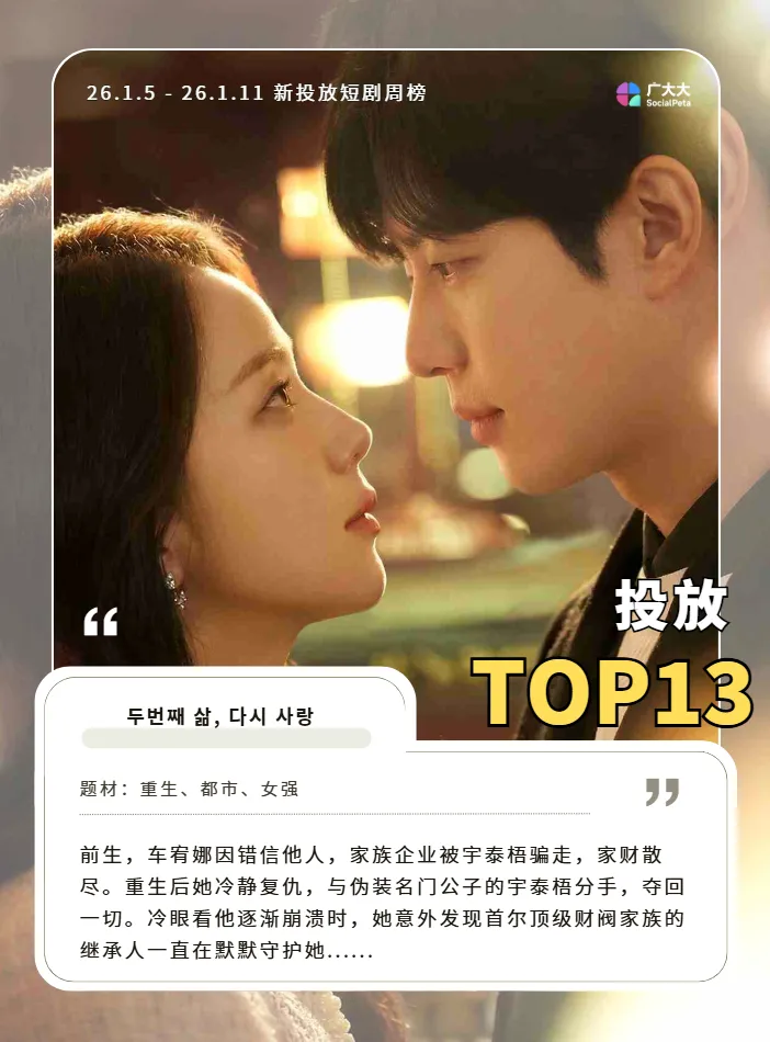 这部短剧同样来自韩国。值得注意的是,近两周已有两部韩国短剧登上周榜,这表明短剧在韩国市场的影响力正持续增强,呈现出多版本同台竞技的活跃态势。