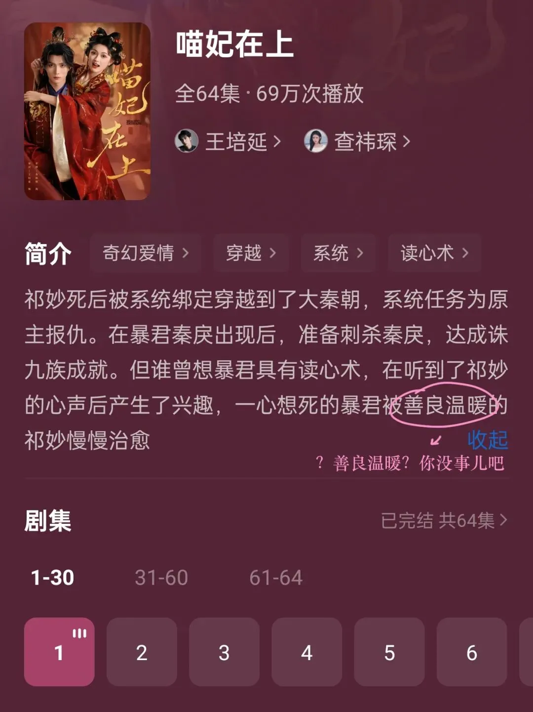 此剧男女主的精神状态都非常美丽,美到可以进入“年度精神状态美丽奖”提名名单。同时,男女主的“有病”程度可以进入“年度双向奔赴病情奖”提名名单(张呈语气:两个 精神病~)。但为什么最终把秦戾放在这个比谁更想死的“年度心同死灰奖”提名名单中呢?因为此剧剧情薄弱且不流畅,撑不起男女主的疯癫人设,而秦戾的想死内心戏是真挺多。例举一些秦戾想死的os:“好特别的心声,她竟然跟朕一样想死。”“死在她手里倒也尚可。”“小猫儿(指女主)给所有人送了致命大礼,怎么我就没有?”......