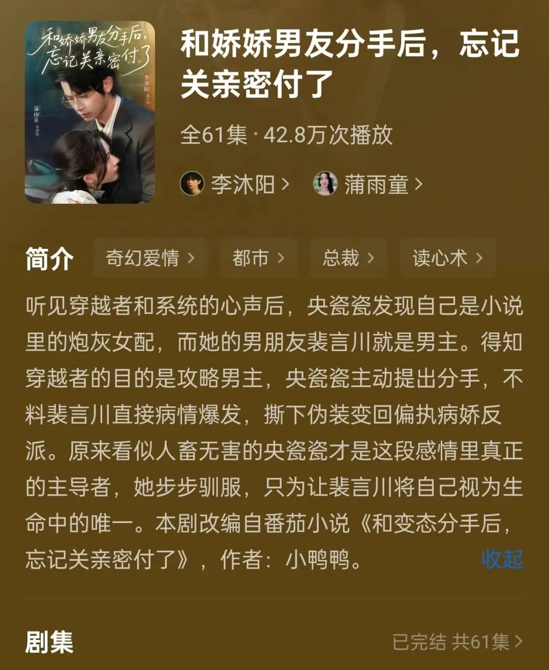 ♢《和娇娇男友分手后,忘记关亲密付了》央瓷瓷&裴炎川(首播日期:2025.8.28 共61集)