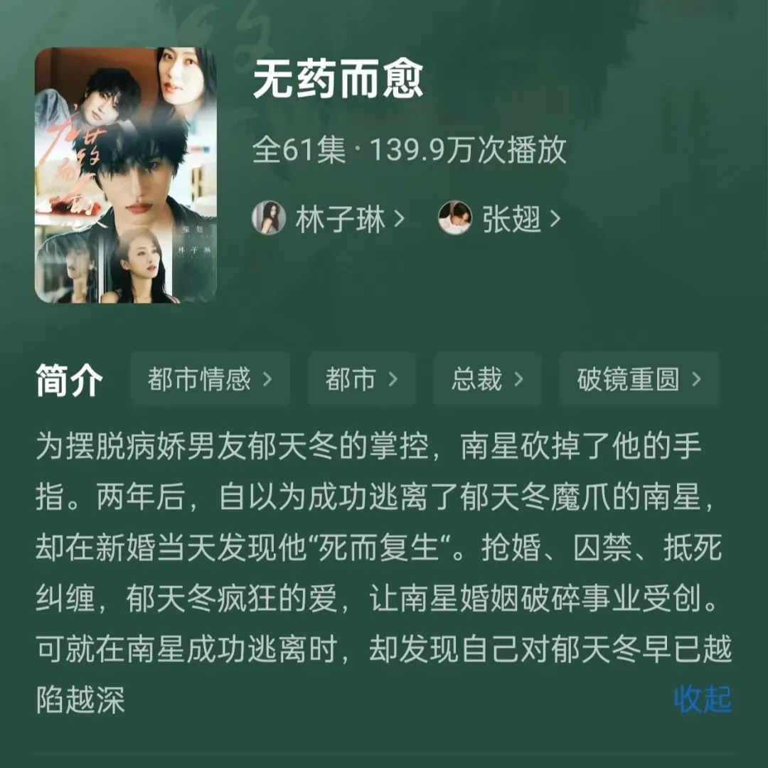此剧的画面质感,演员演技和颜值皆不输正剧,比较可惜的是郁天冬病因相关剧情有些牵强。先不说南星、郁天冬的病情,这部剧里心理健康的人屈指可数,爱看颠公颠婆的可以爽看了。开篇剧情直接一个大招:郁天冬囚禁了南星,南星为出逃,迷晕郁天冬后砍下他的手指去解指纹锁,被砍手指的郁天冬疼得面目狰狞但狂笑:“恭喜你,切对(手指)了。”(此处bgm用了《Laughing On The Outside》,视听双爽啊)结尾,南星终于正视自己对郁天冬的感情,心甘情愿被囚禁。对她来说,正视自己的“不正常”就是一种治愈。而郁天冬选择放南星自由,也算是与他强制执念的一种和解。(放她自由指没囚禁,结局he。