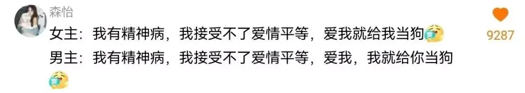 如果说姜许对病娇的接受程度是“人上人”,那么央瓷瓷对病娇的接受程度可以给到一个“夯”。央瓷瓷知道男友裴炎川是病娇后,一直期待渴望以及乞盼裴炎川对自己使出病娇的手段,而裴炎川为了不吓到央瓷瓷一直在隐忍克制以及压抑自己的病娇属性...(算我求你,别忍了...(第二季速速抬上来,想看两个神入“爆裂”爱啊。