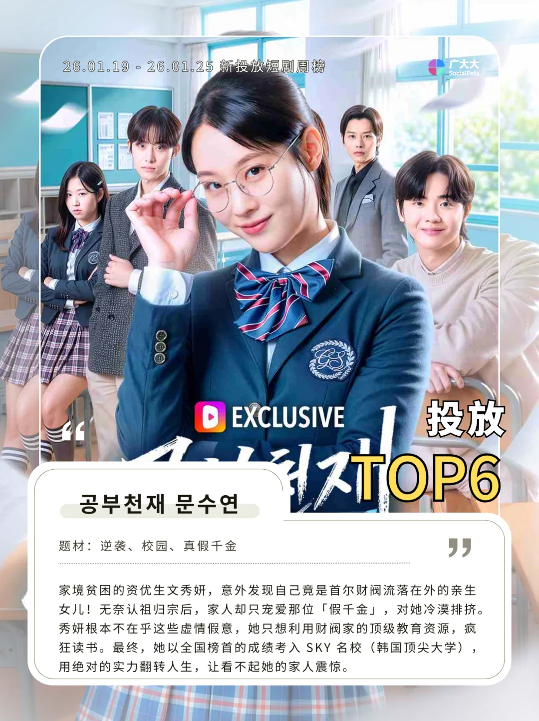 又一部国内爆款的出海转内销,本次榜单第6的《공부천재 문수연》改编自国内短剧《真千金她是学霸》,女主设定也本土化成为了首尔财阀的亲女儿。从目前笔者看到的剧情来看,整体剧本还原度较高,服化道也都针对韩国进行了部分改造。