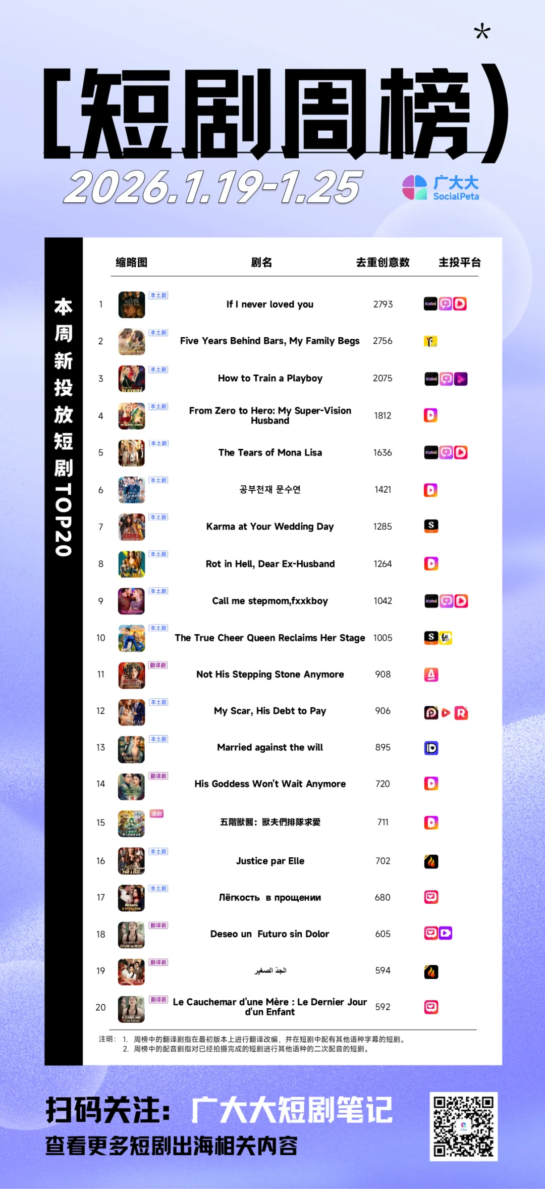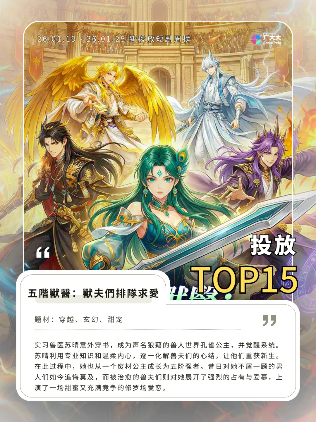 26.01.19 - 26.01.25 新投短剧周榜:周期内在投短剧约1.15W部,新上短剧约1.81K,新剧占比约为15.7%;周期内在投漫剧约170+,比前一周上涨约42.1%。本周我们选取的三部短剧分别可以概括为女杀手调教花花公子、韩版真千金是学霸以及穿越漫剧兽夫排队求治愈,其中奥妙待我细细道来。