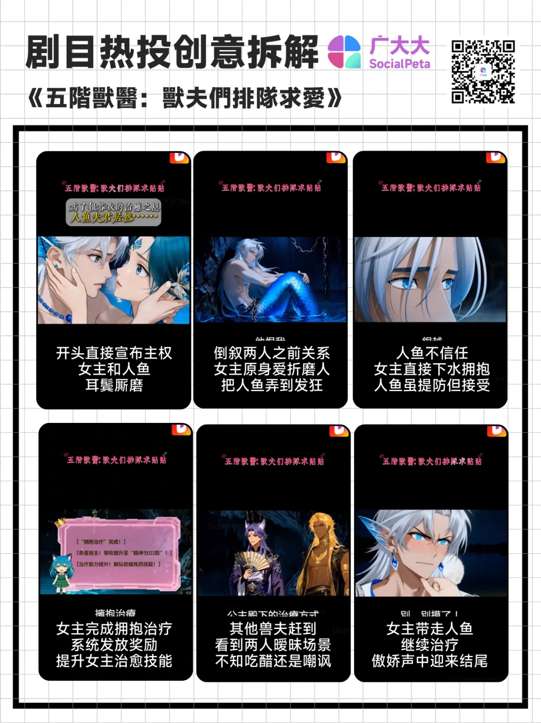 在投放素材上,这部短剧的爆款创意从短到长均有涉猎,今天我们主要看看下面这条时长在2min51s的素材。该创意属于一上来就给个王炸的那种,人鱼王子直接和女主肌肤相亲,引得女主娇嗔不已,同时也快速抓住了观众注意力;之后则用倒叙直接切回女主刚穿越回来给其治伤的节点,刻画两者的暧昧拉扯,中间其他兽夫的到来也给这些剧情增加更多的想象空间。