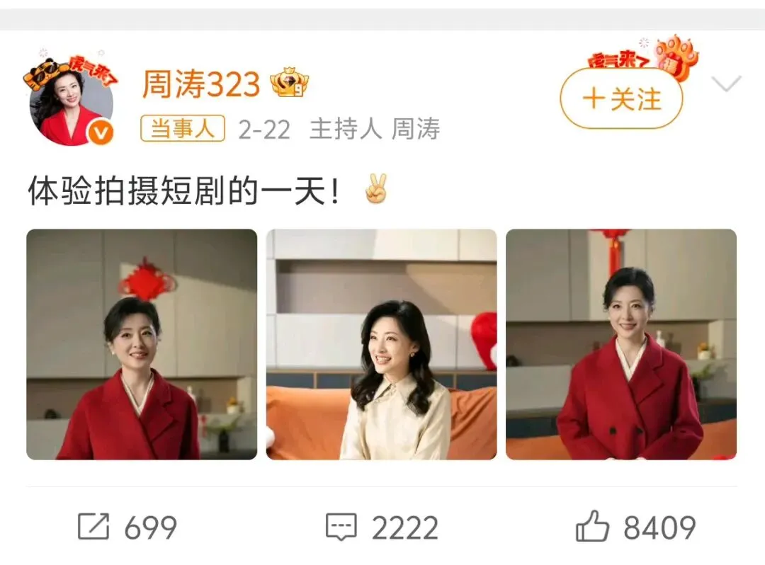 娄艺潇不甘只做演员,以主演+出品人双重身份,推出《我为将军披战袍》《套现人生》《三秒预见你》,从古装将军到年代厂花,再到落魄影后,试图在短剧里拓宽戏路。最让人意外的是周涛,这位主持17届春晚的“国民主持”,首次试水就带来贺岁短剧《马年春节一场大雨,竟把我淋成好运顶流》,饰演接地气的“桃桃”,把端庄大气与市井烟火气完美融合,一上线就引爆话题。