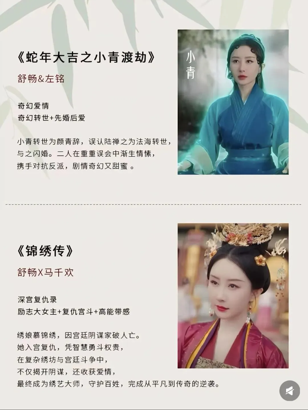舒畅则是童年女神回归观众视野的代表,凭借《唯有相思意》《凤栖今朝》等作品站稳脚跟,穿越、甜宠、权谋样样都来,当年小玉、傻妞的灵气不减,一出场就拉满怀旧情怀。