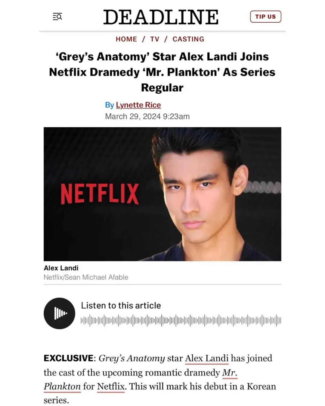 Alex Landi 今年31岁,已经在影视行业工作八年,他在《实习医生格蕾》中饰演的Kim医生一角最为人所知。这个角色最初设定为配角,但因融入Queerbaiting元素而备受瞩目,成为该系列首位男同性恋外科医生和首位亚洲男性外科医生,深受互联网观众喜爱。他共参与了44集的拍摄,这个角色也成为他职业生涯的亮点。