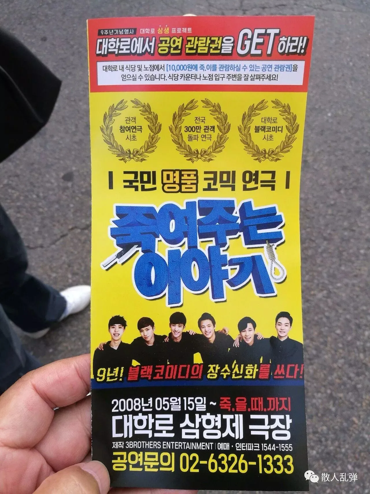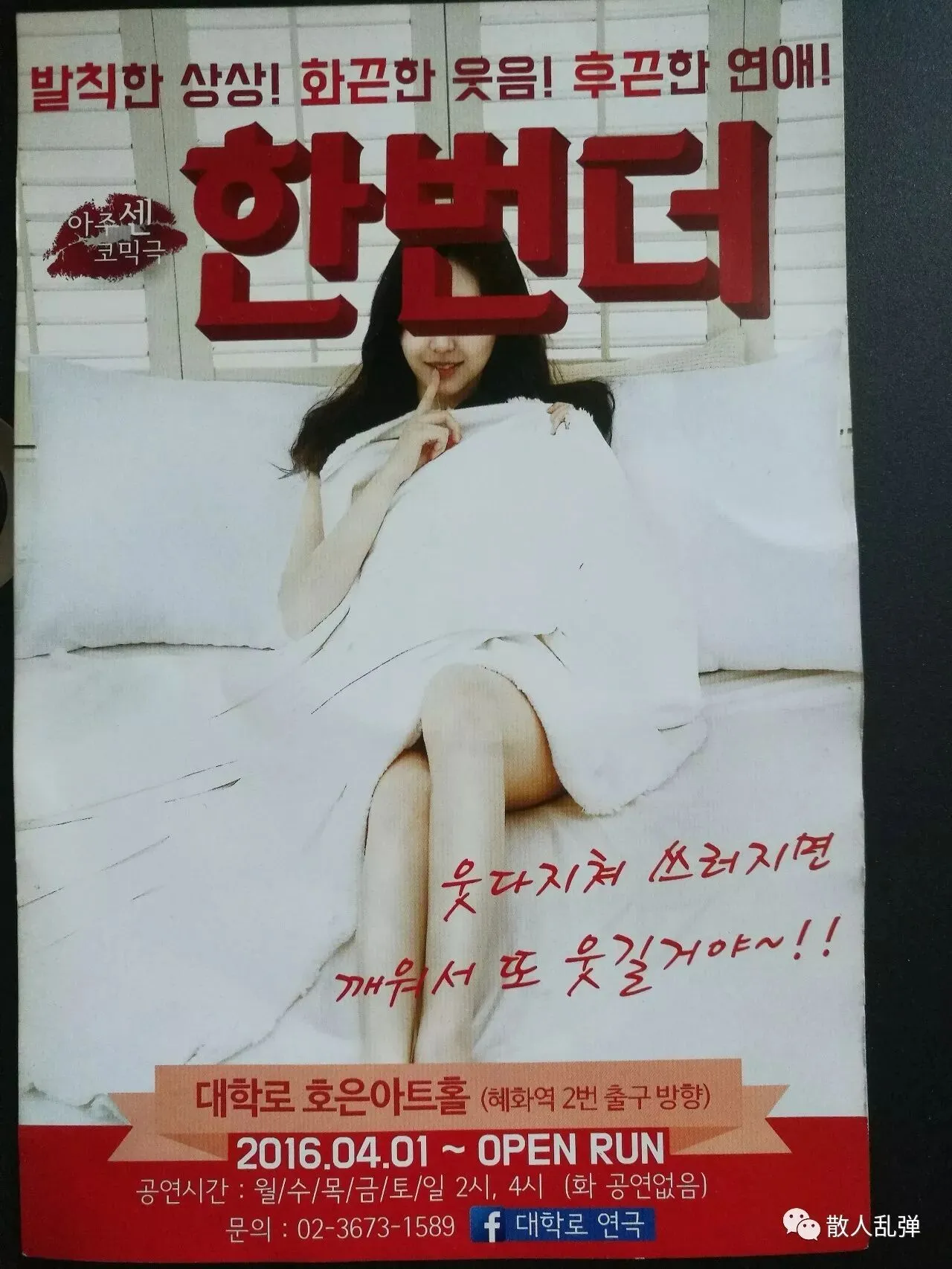 我看的三场学生戏都是喜剧。因为我是自由行,看过戏后回到酒店,和宾馆里懂一点儿中文的韩国服务员经过切磋,把这三个戏的名字分别定为《悲剧中的喜剧》、《租房保证金》、《再一次》。
