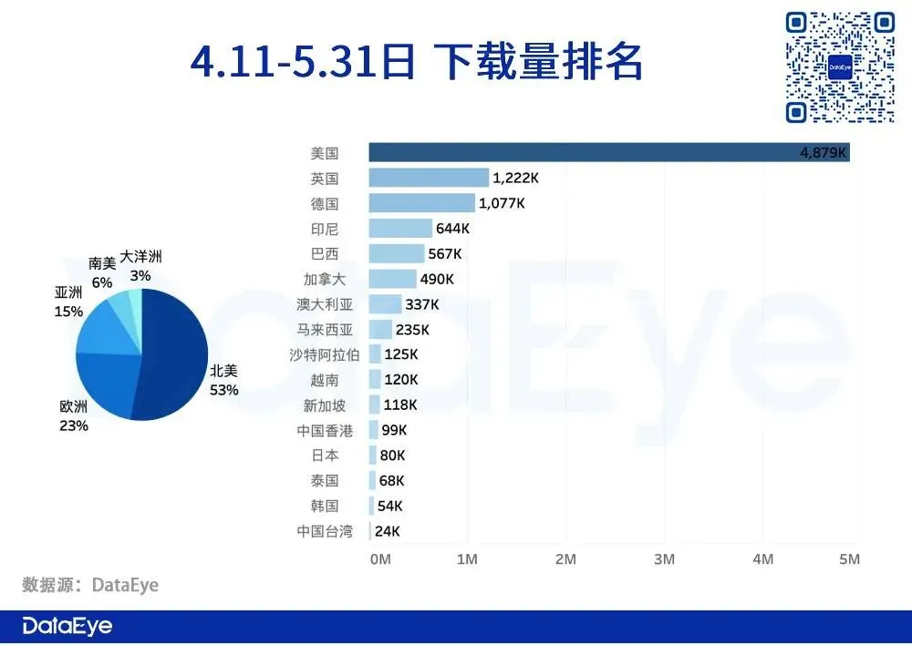 今年休闲游戏出现一批黑马——《Monopoly Go!》。该游戏上线后称霸超40多个国家iOS免费榜Top10,月收入破亿!然而,却被不少媒体质疑“换皮”《Coin Master》?具体在市场方面,有着怎样表现?究竟是怎样的一群人在玩?今天DataEye研究院以该游戏最高收入的美国作为视角,聊聊《Monopoly Go!》。下载量方面,《Monopoly Go!》在欧美地区下载占比大头约80%,美国遥遥领先位居Top1,约为Top2英国的3倍+。亚洲地区下载该游戏的热情度远不及欧美地区。亚洲地区中,东南亚国家下载量比日韩和港台下载量高。