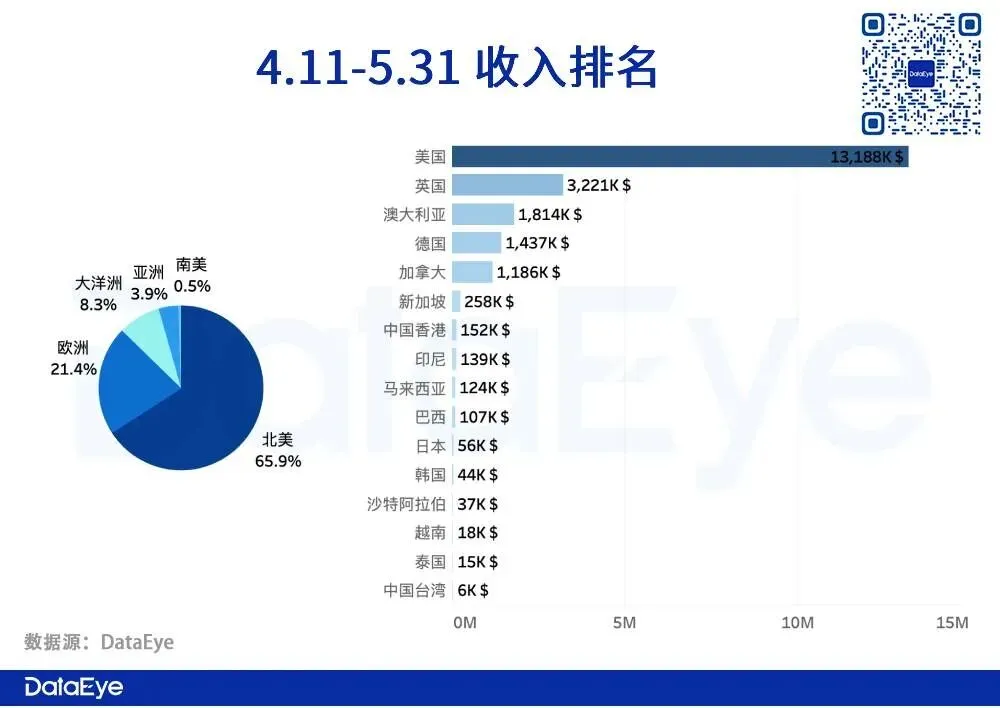 收入,欧美地区仍占比大头,美国收入最高,收入约为第二国家英国的4倍。亚洲区域付费占比小于5%,收入最高的亚洲国家为新加坡。