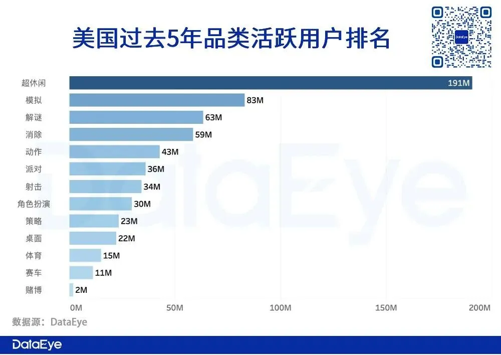 欧美玩家的下载量远高于亚洲地区玩家。尤其美国断层Top1,是欧美地区喜欢休闲游戏的代表国家,亚洲地区中仅有印尼上榜前5。在过去5年美国品类活跃用户来看,排名前7的品类全部为轻度游戏。