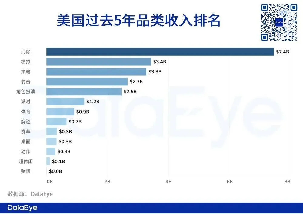 重度游戏收益高,这一说法更适用于亚洲地区而非欧美地区。欧美玩家更喜欢为休闲游戏付费,特别是“博彩”、“老虎机”。《Monopoly Go!》收入Top5国均为欧美国家,公认的游戏付费大国日韩付费排10名开外。从2018-2022过去五年美国手游收入的数据来看,相比亚洲地区玩家,美国玩家对休闲品类游戏有更强的偏好,策略、角色扮演等重度游戏收入远不及消除、模拟类偏中轻度的休闲游戏。