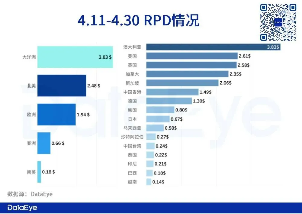 大洋洲表现最好,具体为澳大利亚,其次为北美以及欧洲,亚洲和南美地区平均RPD不超过1美金。亚洲地区中仅有新加坡和中国香港RPD超1美金。