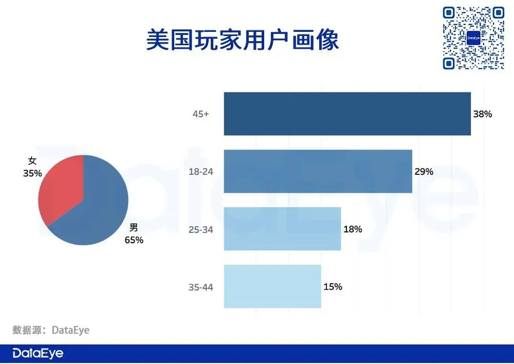 用户画像:男性玩家占比超6成,玩家年龄主要分部在45+的中老年人以及18-24的年轻人。