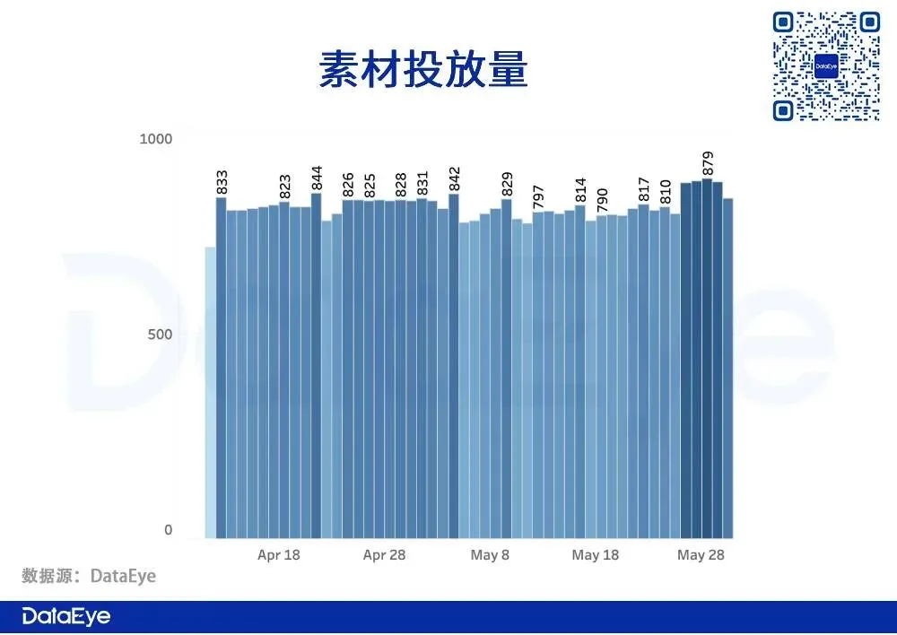 素材投放趋势整比较平均,无明显增幅和跌落,日均稳定在750-850区间。