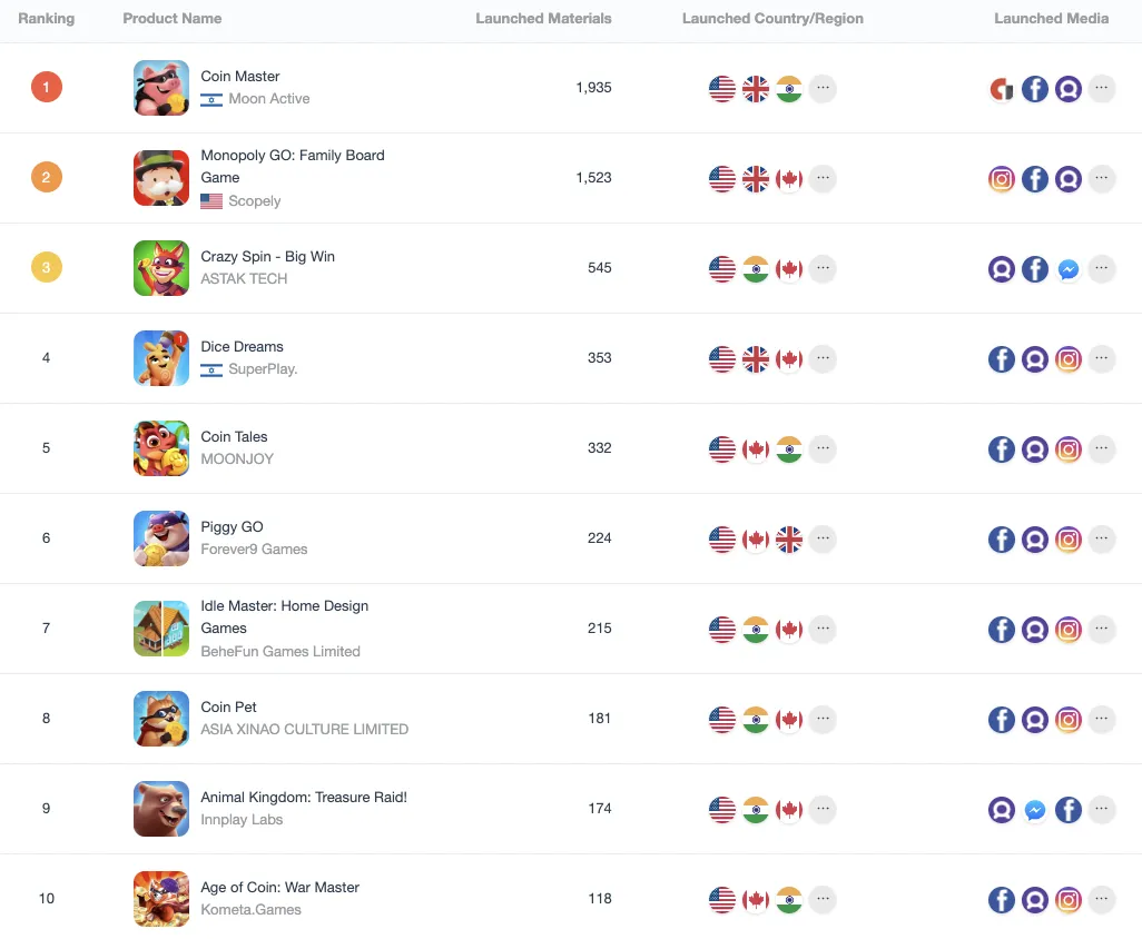 ADX海外版(关注公众号回复:海外,免费试用)数据显示,近30日内同类游戏投放量中,《Monopoly Go!》(苹果谷歌双端合并)排名第二,大幅超过其它同类手游。