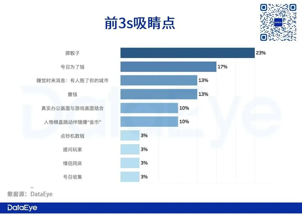 吸睛点主要为:展示代表游戏核心物品(扔骰子)、紧急/危机事件(城市被毁危机)以及“金钱”相关。