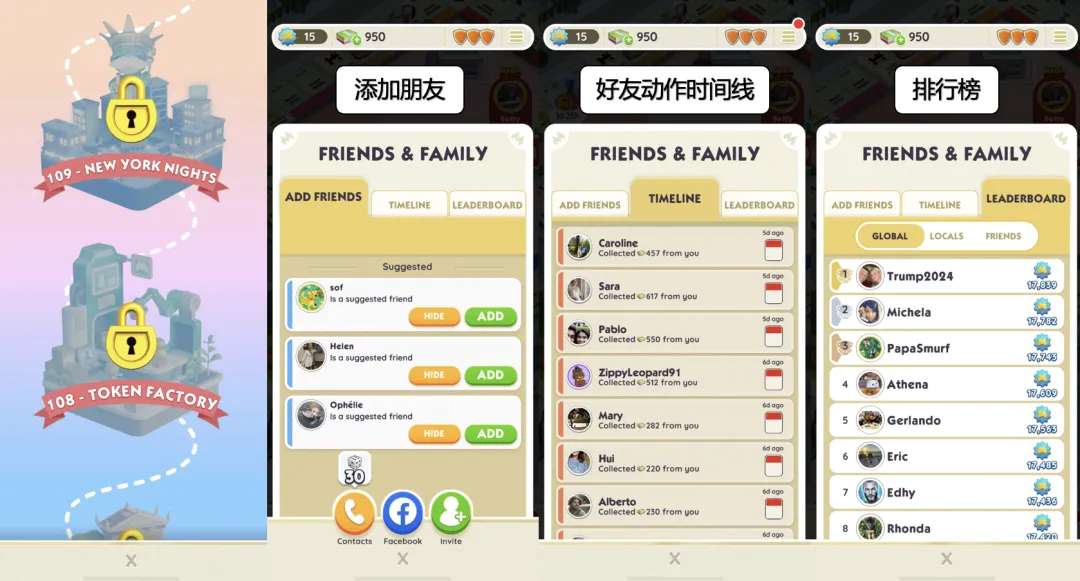 当然,《Monopoly Go!》也存在隐忧:快节奏有利有弊。该游戏舍去了原本强多人桌面对战的玩法,但保留了一定的社交属性,如添加好友(可以摧毁掠夺好友的城市建筑以及)、时间线(查看好友动作)、全球排行榜(等级徽章)三个功能。这样的大富翁“阉割”手游版本更轻松了,组局条件大幅下降,但也会让一部分玩家失去了多人“尔虞我诈”的乐趣。新加入的建造城市玩法,游戏城市(地图)建造关卡已经到了109关,社交仅限偷偷去砸了朋友已经建造好城市的建筑。新城市地图推出的节奏或许是《MG》玩家新鲜感的唯一来源。