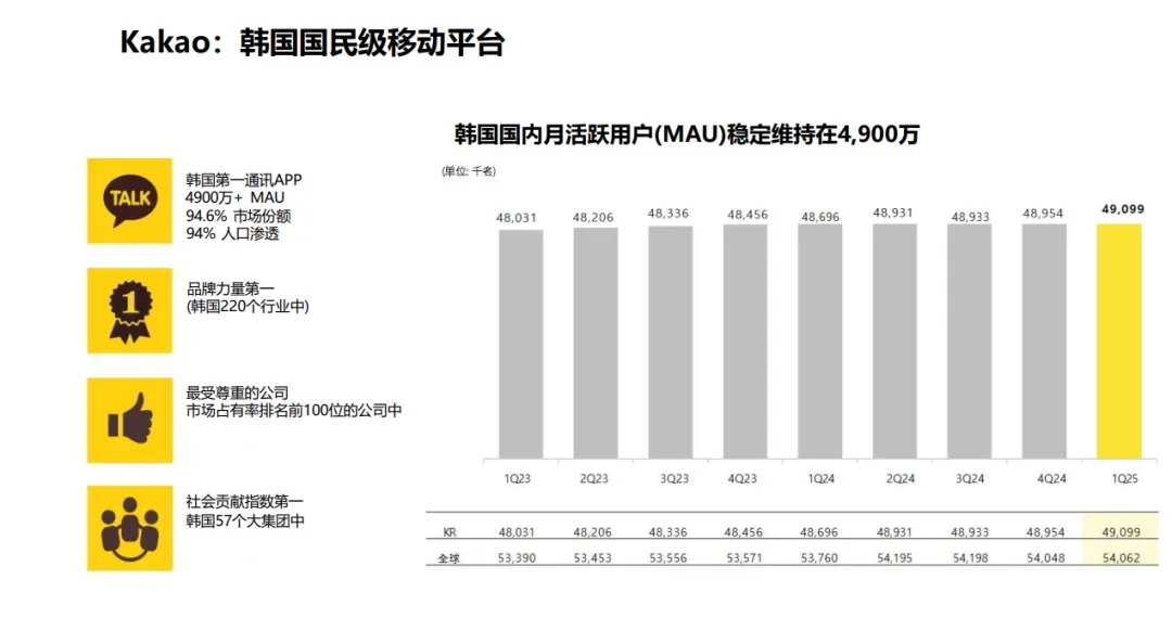 更关键的是,传统流量渠道已无红利:TikTok、Meta投放CAC上涨40%+,素材内卷、审核收紧,流量彻底触顶,中腰部厂商几乎没有生存空间。而韩国互联网被Kakao、Naver“双寡头”垄断,合计覆盖95%以上网民,本土超级平台成为短剧出海韩国的唯一增量入口。其中Kakao更是核心中的核心:旗下Kakao Talk拥有4900万MAU,韩国人口渗透率94%,是日均打开50+次的国民级通讯APP,月均打开761亿次,流量优先级远超所有海外平台,更是韩国220个行业中品牌力量第一、社会贡献指数第一的企业,国民信任度拉满。
