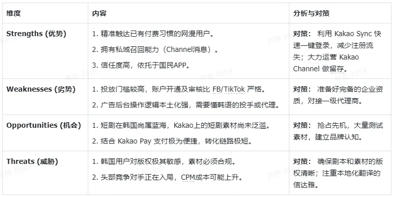 选择Kakao Moment,本质是走一条“高门槛、高回报”的路线,其优劣势、机会与威胁都十分鲜明,找对对策才能扬长避短: