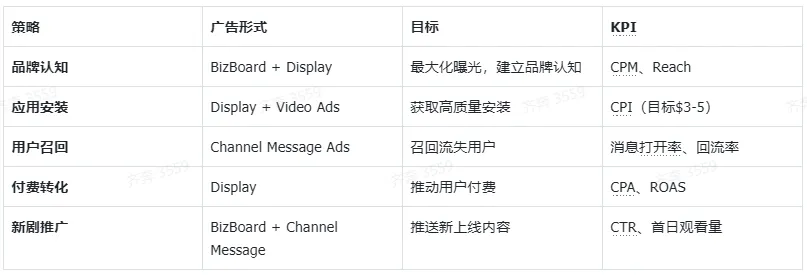 根据不同的运营目标,搭配对应的广告形式,同时设定清晰的KPI,让投放效果可量化、可优化,核心投放策略如下: