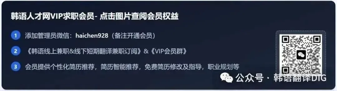 《韩语VIP求职会员》 每日韩语兼职&官方精选韩语全职订阅&免费面试,简历,跳槽等求职指导&名企内推机会&免费职业规划; 1.《中韩人脉网》专属会员平台每日韩语兼职&官方精选韩语圈子订阅。 2.《韩语人才网官网》简历置顶及简历智能推送。 3.免费面试,简历,跳槽等求职指导&名企内推机会&免费职业规划; 添加管理员微信haichen928(开通会员) | |