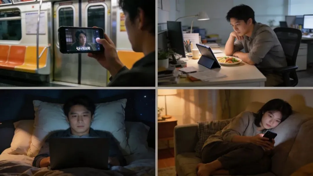 图注:通勤、午休、睡前、居家——短剧嵌入生活的四个典型场景