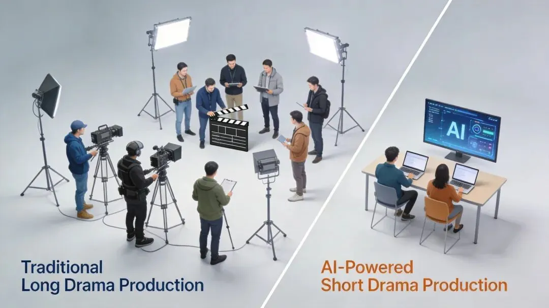 图注:传统大剧组制作与AI赋能小团队制作的对比