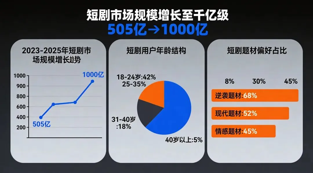 图注:短剧市场规模增长、用户画像与题材偏好数据可视化