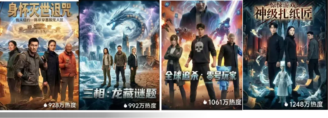 由山海万境AI创作的《身怀灭世诅咒》《三相:龙藏谜题》《全球追杀·零号玩家》《神级级扎纸匠》等4部作品,都已经登上红果漫剧,平均热度值在1000万左右。