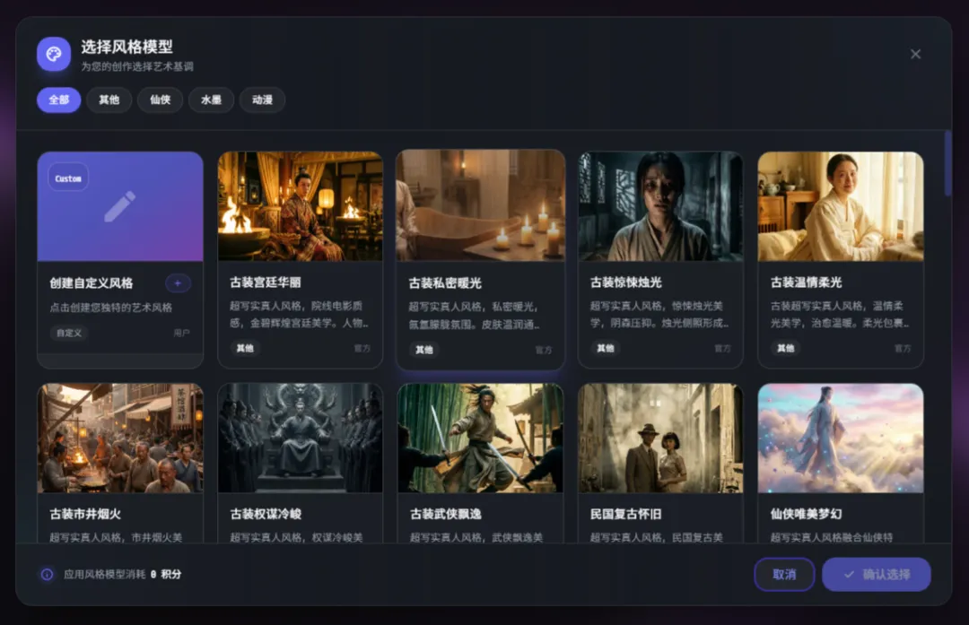 在开始一个项目之前,首先要选择风格模型,包含UE5、水墨、日式、3D、仙侠、现代古装等十几个大类,50种既定细分风格,用户也可以自己定义。以现代年代怀旧风格为例,真实自然光、复古褪色滤镜、轻微胶片颗粒、4K纪录片质感等参数都写得很细。