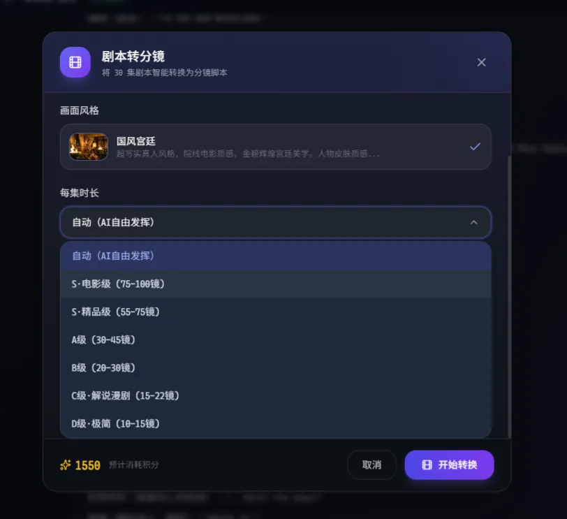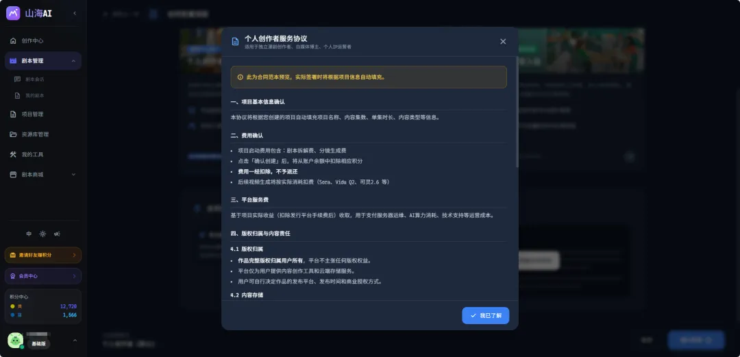 即便在项目创建之前的剧本阶段,创作者每进行一个动作,也都会看到对应的积分消耗提示。创作者确认之后,系统才会进入下一步。