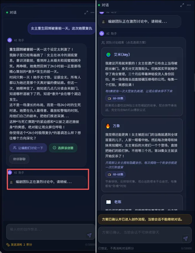 接下来,创作者可以选择让编剧们讨论一下,也可以直接确定这个创意;如果并不满意,还可以继续对话修改。如果你选择让编剧们讨论一下,系统就会提示你,需要消耗1个积分。