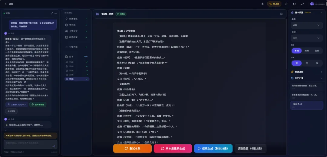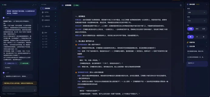 整个剧本从创意,到世界观、人物设定、剧情框架、分集大纲,再到最终剧本,都会被完整呈现出来,并允许创作者反复修改。这更像传统影视行业的开发流程,而不是很多AI工具那种“给你一版文案就结束”的逻辑。对真正要靠内容挣钱的人来说,这样的颗粒度才有意义,因为后面的分镜、投流、剪辑、复用,全部都建立在剧本打磨得足够细的基础上。