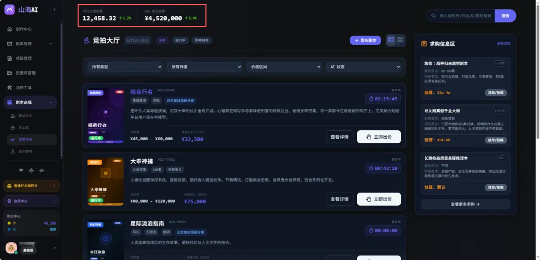 在剧本库之下,还有剧本需求市场。这个市场更像一个剧本交易所,剧本创作者可以自行发布需求和作品,其他人则通过竞拍的方式获得自己心仪的剧本。平台还把大盘指数和24小时成交总额摆了出来,谁在买本子、市场热度高不高、成交活不活跃,至少在产品层面,它都在尽量把这件事做得更透明。