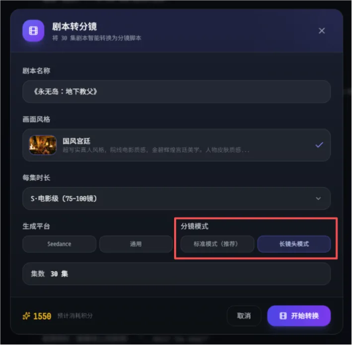 然后是生成平台、分镜模式的选择。这里面,分镜模式也有两种,一种是普通分镜模式,另一种是长镜头分镜模式,用户可以自行选择。