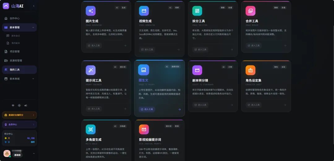 与其他AI短剧创作工具不同的是,万象AI还准备了“我的工具”。里面包括图片生成、视频生成、拆分工具、提示词工具、剧本转分镜、角色设定、多角度生成等10个工具。