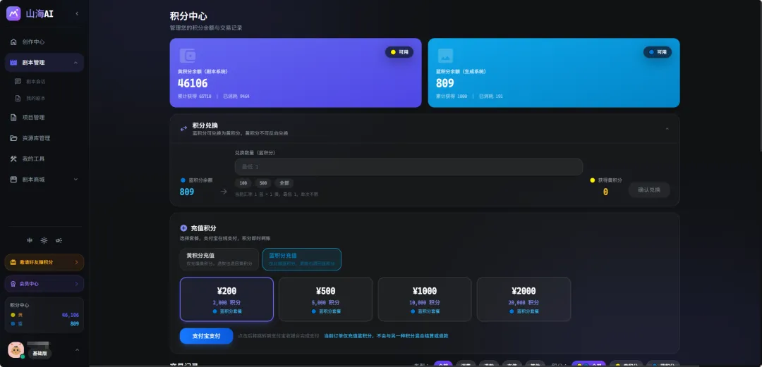 在山海万境AI平台上,积分分为两种,黄色和蓝色。剧本生成、对话等各种文字处理,消耗的是黄色积分;而分镜生成、视频生成消耗的是蓝色积分。虽然暂时看不出为什么一定要设立两种积分,但好消息是,目前用邀请码邀请好友,可以获得最高1500积分的返点激励。
